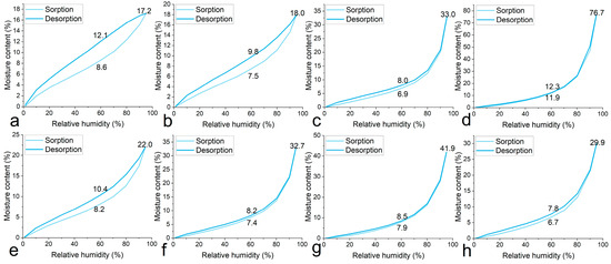 Isotherms of equilibrium moisture contents of untreated WAW sample (a), WAW samples treated by 5 wt% IL (b), 20 wt% IL (c), 40 wt% IL (d), 5 wt% PEG 300 (e), 20 wt% PEG 300 (f), 40 wt% PEG 300 (g), and 40 wt% PEG 2000 (h).