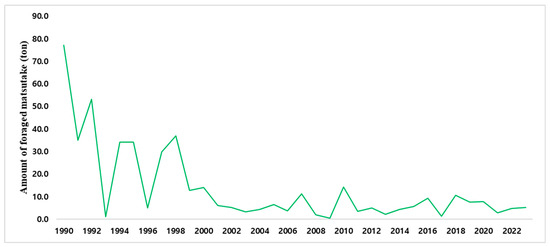 Yangyang-gun is one of the most important provinces for T. matsutake foraging in Gangwon-do, Korea [11]. To assess the temporal variation in the amount of foraged matsutake mushrooms, data on the amount of T. matsutake foraged in Yangyang-gun between 1990 and 2023 were obtained from the National Forestry Cooperative Federation and Yangyang Institute of Technology. Figure 1 illustrates the data regarding the variation in the amount of foraged matsutake mushrooms from 1990 to 2023 [22].