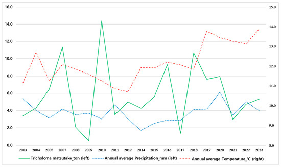 Amount of foraged Tricholoma matsutake, annual average temperature, and annual average precipitation in pine forests of Yangyang-gun, Korea, between 2003 and 2023.