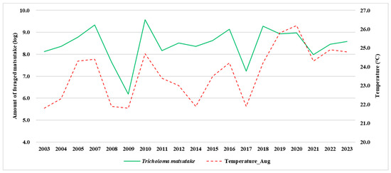 Amount of foraged Tricholoma matsutake and the average temperature in August in the pine forest of Yangyang-gun, Korea, between 2003 and 2023.