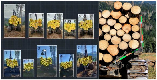 Simultaneously, a manual time and motion study was carried out with the aim of (i) identifying the type of assortment extracted during each cycle, (ii) each cycle duration, and (iii) estimation of the load volume through the use of photogrammetry. Individual load volume of the forwarder was estimated using a rear-end picture of the complete load before unloading, and the diameter estimation was carried out by using Autodesk AutoCAD 2024 [45]. To perform the diameter calibration of each load, two scaled poles were attached to the back of the forwarder loading space on a similar plane to the logs end (Figure 2). The manual study performed also included as a categorical (yes or no) variable the use of the synchronized winch.