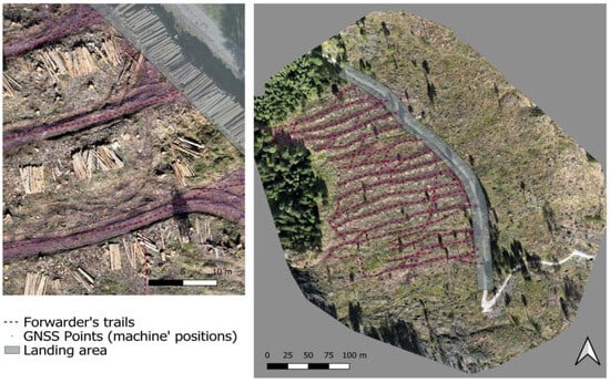 Buffer area considered as landing area. Detail of forwarder paths, piles of to-be-extracted logs, and logs pile included in the landing area (left). Aerial overview of the skidding paths and the landing area buffer (right).