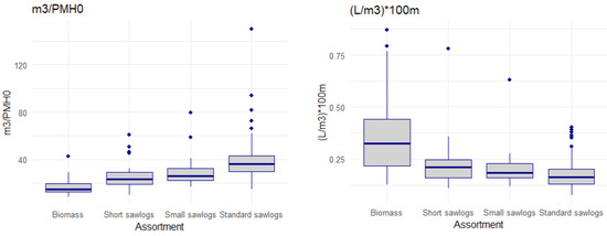 Box plot of productivity m3/PMH0 (left) and fuel efficiency L/m3·100 m (right) distribution among the different assortments’ levels.