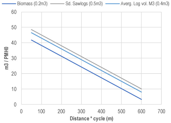Productivity of the forwarder (m3/PMH0) as a function of the average log volume (0.4 m3), biomass average log volume (0.2 m3), and standard log volume (0.5 m3).