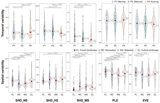 A multivariate analysis of variance (MANOVA) was used to explore the main and interactive effects of time and space on perceptual and physical sound features. The three sampling periods and four functional zones were set as the categorical independent variables, including SHD_NS, SHD_HS and SHD_MS, PLE, and EVE, as well as LAeq, L10, L90, and L10–90, which were the continuous dependent variables. Multivariate tests for the main and interaction effects of time and space were all significant (Tables S6 and S7, Supplementary Materials). Partial eta squared values of 0.01 to 0.06, 0.06 to 0.14, and greater than 0.14 indicate small, medium, and large effects, respectively [49], highlighting the ability of the factor to explain the variance of the dependent variables. The Games–Howell post hoc test using a Bonferroni correction was employed to conduct pairwise comparisons of each dependent variable between the different sampling periods and functional zones, respectively. Bonferroni correction is a commonly used correction method for multiple comparisons, which can effectively decrease the probability of false positive results (type I errors) in multiple pairwise comparisons [50].