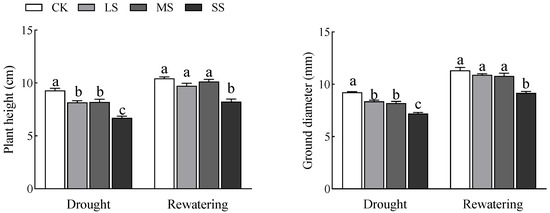 Effects of drought and rewatering on the plant height and ground diameter growth of seedlings. Different lowercase letters on the columns indicate significant differences among drought treatments at the same stage (p < 0.05). CK (water content was 90% ± 5%), LS (water content was 75% ± 5%), MS (water content was 60% ± 5%), and SS (water content was 45% ± 5%).