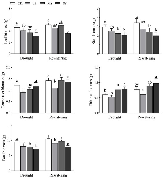 Effect of drought and rewatering on the biomass of seedlings. Different lowercase letters on the figure columns indicate significant differences among drought treatments at the same stage (p < 0.05). CK (water content was 90% ± 5%), LS (water content was 75% ± 5%), MS (water content was 60% ± 5%), and SS (water content was 45% ± 5%).
