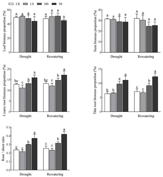 Effect of drought and rewatering on the biomass proportions of seedlings. Different lowercase letters on the figure columns indicate significant differences among drought treatments at the same stage (p < 0.05). CK (water content was 90% ± 5%), LS (water content was 75% ± 5%), MS (water content was 60% ± 5%), and SS (water content was 45% ± 5%).