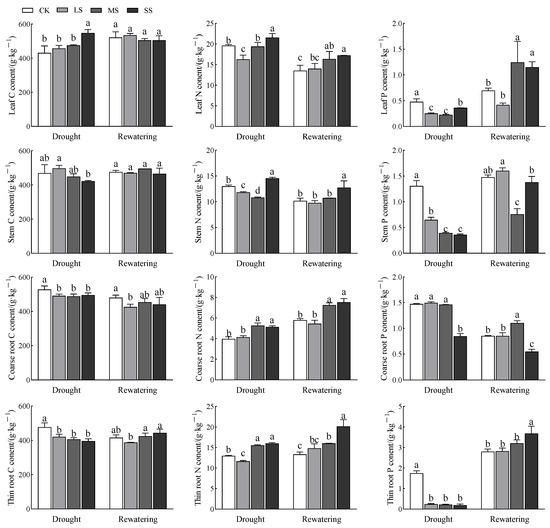 The C content in leaves of SS-treated seedlings was the highest (547.8 g/kg) under drought stress, and it was 27.2% higher in seedlings in the SS than in the CK (p < 0.05); however, no significant difference in the leaf C content between SS and CK seedlings was observed after rewatering (Figure 4). This may be because C, as a basic structural substance, has high stability in plants. The C content in coarse and thin roots of seedlings treated with LS, MS, and SS was significantly lower than that of seedlings treated with CK because of drought. After rewatering, the content of C in the coarse and thin roots of seedlings in the LS was 425.7 and 387.75 g/kg, which was significantly lower than that of CK seedlings by 11.34% and 6.73%, respectively (p < 0.05). Because of the drought, the leaf N content of seedlings in the LS was 16.29 g/kg, which was 16.93% lower than that of CK seedlings, and that in the SS was 21.57 g/kg, which was 10% higher than that of the CK. The stem N content was 11.82 g/kg and 10.82 g/kg in the LS and MS treatments, which was significantly lower than that in the CK by 9.15% and 16.83%, respectively; the stem N content in the SS was 14.54 g/kg. Compared with CK, it was significantly higher by 11.76%. The N content in coarse roots of MS and SS seedlings was 5.26 and 5.13 g/kg, which was 32.49% and 29.22% higher than that of CK seedlings, respectively. The content of thin root N in the LS was 11.63 g/kg, which was 10.12% lower than that in the CK. The content of thin root N in the MS and SS was 15.54 and 15.99 g/kg, which was 20.09% and 23.57% higher than that in the CK, respectively. After rewatering, the N content in every organ of seedlings with LS, MS, and SS increased, and it was the highest in the SS. The content of N was 27.41%, 25.49%, 29.31%, and 51.13% higher in the leaves, stems, coarse roots, and thin roots, respectively, in the SS than in the CK. This may be due to the increased availability of N after rehydration. Under drought stress, P contents in leaves and thin roots of LS, MS, and SS seedlings were significantly lower than those of CK, but they significantly increased after rewatering. After drought stress, the stem P content was 50.38%, 70.23%, and 72.52% lower in the LS, MS, and SS than in the CK, and these differences were significant. After rewatering, the stem P content was significantly lower in the MS (0.76 g/kg) than in the CK. The content of P in the coarse roots of seedlings treated with SS was 0.85 g/kg after drought stress, which was 42.18% lower than that in the CK; this difference was statistically significant. After rewatering, the content of P in the coarse roots was significantly lower in the SS treatment, and the content of P in MS was significantly higher than that of CK. It may be that the drought restricted the seedlings more by P, but this condition was relieved after rewatering.