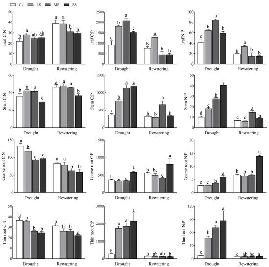 The C:N ratio of the leaves of P. yunnanensis seedlings treated with LS was 27.83% higher than that of CK treatment (p < 0.05), and this difference was significant; however, the C:N ratio of MS and SS-treated seedlings was significantly lower than that of CK seedlings after rewatering (Figure 5). After drought stress, the stem C:N ratio was 16.79% and 15.23% higher in the LS and MS than in the CK, respectively, and it was 19.26% lower in the SS than in the CK. After rewatering, there was no significant difference in the stem C:N ratio of the LS and MS with the CK, and the stem C:N ratio was only significantly lower in the SS compared with the CK. After drought stress, the C:N ratio of the coarse roots was 10.57%, 30.26%, and 27.59% lower in seedlings treated with LS, MS, and SS than in CK seedlings, respectively, and these differences were significant. However, the C:N ratio of the coarse roots was still lower in the MS and SS than in the CK after rewatering. After drought stress, the C:N ratio of the thin roots was 29.13% and 32.77% lower in MS and SS-treated P. yunnanensis seedlings than in CK seedlings, and these differences were significant. After rewatering, the C:N ratio of the thin roots was significantly lower in the LS, MS, and SS than in the CK. After drought stress, the C:P ratio of the leaves and thin roots was higher in LS, MS, and SS-treated seedlings than in CK seedlings. After rewatering, the C:P ratio was significantly higher in LS-treated leaves than in CK leaves. After drought stress, the C:P ratio was 113.53%, 218.83%, and 230.08% higher in LS, MS, and SS-treated leaves than in CK leaves, and these differences were significant. After rewatering, the C:P ratio was only significantly higher in MS-treated leaves than in CK leaves. After drought stress, the C:P ratio of LS and MS-treated coarse roots was 8.22% and 6.75% lower than that of CK seedlings, and these differences were significant. After rewatering, the C:P ratio of the coarse roots was only significantly lower in the MS than in the CK, and it was significantly higher in the SS than in the CK. The N:P ratio of leaves and thin roots of seedlings under drought stress was significantly higher than that of CK in LS, MS, and SS treatments, but after rewatering, the N:P ratio of leaves under LS and thin roots under SS was still significantly higher than that of CK. The stem N:P ratio was 83.08%, 176.18%, and 308.71% higher in the LS, MS, and SS than in the CK after drought stress, and it was significantly higher in the MS and SS treatments than in the CK after rewatering. After drought stress, the N:P ratio of the crude roots of seedlings treated with MS and SS was 33.46% and 126% higher, respectively, than that of CK seedlings; the N:P ratio of the crude roots was only significantly higher in SS-treated seedlings than in CK seedlings after rewatering.
