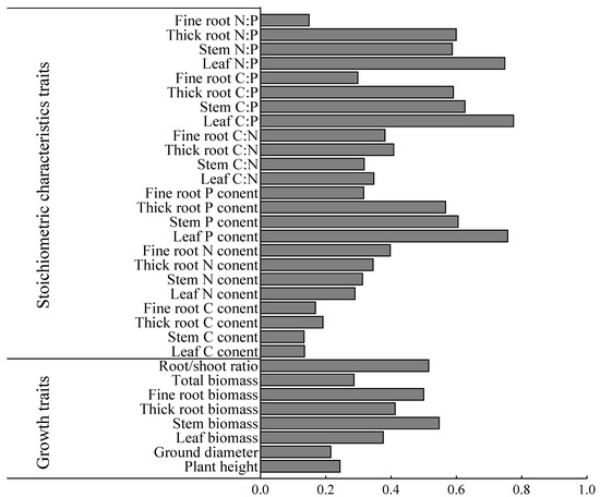 The growth indexes of P. yunnanensis seedlings and the stoichiometry of C, N, and P were analyzed using the phenotypic plasticity index (Figure 6). The phenotypic plasticity index of seedlings after rewatering ranged from 0.13 to 0.78 (Figure 6). The phenotypic plasticity index of stem biomass was the largest (0.55), followed by the root/shoot ratio and thin root biomass, and the phenotypic plasticity index of ground diameter was the smallest (0.22). The phenotypic plasticity index of leaf C:P was the largest (0.78), followed by leaf N:P and leaf P, and the phenotypic plasticity index of stem C was the smallest (0.13). The stem biomass, root/shoot ratio, thin root biomass, leaf C:P, leaf N:P, and leaf P of P. yunnanensis seedlings indicated that they were highly adaptable to drought and rewatering.