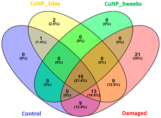 Venn diagram showing the number and percentage of fungal taxa on four groups of beech seeds: control, 1 day and three weeks after treatment with CuNPs, and damaged seeds.