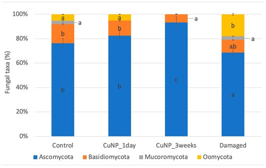Taxonomic structure of fungal community on the seed coats of beech nuts: control, 1 day and three weeks after treatment with CuNPs, and damaged (control—non-treated seeds, CuNP_1day—seeds one day after treatment with nanoparticles, CuNP_3weeks—seeds three weeks after treatment with nanoparticles, damaged—damaged seeds without nanoparticles). Within each phylum, different letters indicate significant differences obtained using the Tukey test; p ≤ 0.05, error bars denote standard errors.