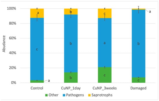 Trophic form structure of fungal community on the seed coats of beech nuts: control, 1 day and three weeks after treatment with CuNPs, and damaged. (Control—non-treated seeds, CuNP_1day—seeds one day after treatment with nanoparticles, CuNP_3weeks—seeds three weeks after treatment with nanoparticles, damaged—damaged seeds without nanoparticles). Within trophic groups, different letters indicate significant differences obtained using the Tukey test; p ≤ 0.05, error bars denote standard errors.