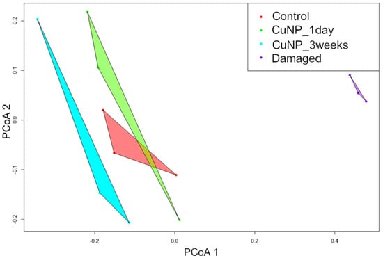 The collected seeds were divided into 4 groups, corresponding to experimental treatments, three groups of which comprised undamaged seeds. The first group consisted of control seeds (control) not treated with nanoparticles. The second and third groups consisted of seeds soaked in a nanoparticle solution and subjected to genetic analysis 1 day after treatment (CuNP_1day) and 3 weeks after treatment (CuNP_3weeks). Additionally, the experiment included a group consisting of seeds that were damaged and were not treated with nanoparticles (damaged). The experiment was repeated three times, with 30 seeds per group in each replicate.