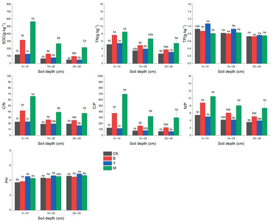 The effect of downed log decomposition on the soil physicochemical properties. Uppercase letters indicate significant differences between different soil depths for the same tree species, while lowercase letters signify significant differences between different tree species at the same soil depth. The data presented in the graphs are shown as the mean ± standard deviation. The tree species included are L. hancei (Y), L. xylocarpus (M), C. wattii (B), and the control sample site (no downed logs) (CK). The key parameters measured were as follows: TOC (organic carbon), TN (total nitrogen), TP (total phosphorus), C/N (carbon-to-nitrogen ratio), C/P (carbon-to-phosphorus ratio), N/P (nitrogen-to-phosphorus ratio), and pH (soil pH).