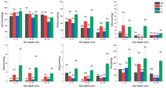 Significance plot of the effect of downed log decomposition on soil enzyme activity. Uppercase letters indicate significant differences between different soil depths for the same tree species, while lowercase letters denote significant differences between different tree species at the same soil depth. The data presented in the graphs are expressed as mean ± standard deviation. The tree species analyzed include L. hancei (Y), L. xylocarpus (M), C. wattii (B), and the control sample site (without downed logs) (CK). The enzymes measured are CAT (catalase), POX (polyphenol oxidase), CB (cellobiose hydrolase), AG (α-glucose xylanase), BG (β-glucosidase), and XS (β-xylulose).