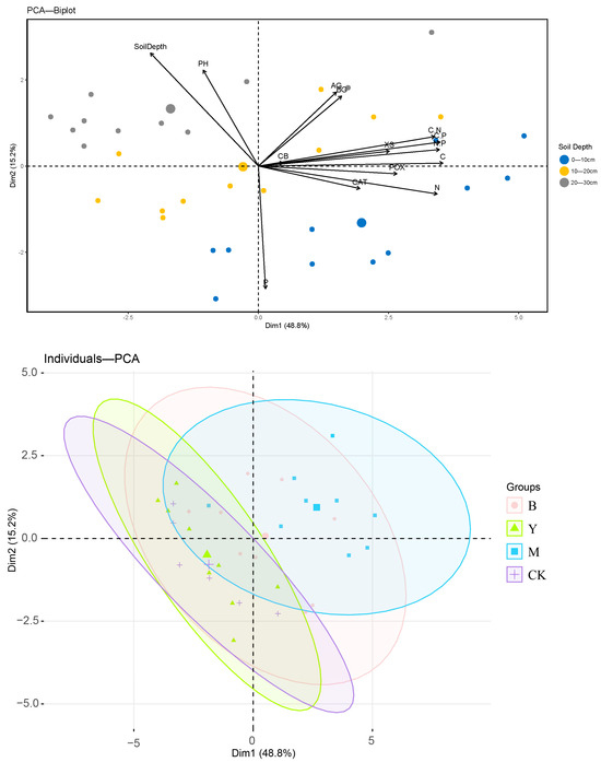 Figure 4 illustrates the significant effects of downed log type and soil horizon on soil physicochemical properties and enzyme activities, as revealed through the PCA. The first principal component (DIM1) accounted for 48.8% of the variance, whereas the second principal component (DIM2) explained 15.2%. Together, these components effectively capture the variance characteristics of the data. The results revealed that the decomposition of downed logs affects important physicochemical indicators, such as organic carbon (SOC) and total nitrogen (TN), as well as the activities of many enzymes in the soil. Chemical properties such as the SOC, TN, TP, C/N ratio, C/P ratio, and N/P ratio and indicators of soil enzymes (CAT, POX, CB, AG, BG, and XS) were distributed in different directions, and soil enzymes such as CAT, POX, and CB had relatively high loading values in the first axis in the positive direction, which indicated that these enzymes had relatively high activities in the surface soil (0–10 cm). The loading values of the SOC and TN decreased with increasing soil depth (10–20 cm and 20–30 cm), indicating that soil depth had a negative effect on these factors. The sample points at different soil depths (0–10 cm, 10–20 cm, and 20–30 cm) were more dispersed in the graph, indicating that the effect of the soil level on the samples was significant. The samples from 0–10 cm were concentrated in the positive direction of the first axis, whereas the samples from 20–30 cm were mostly distributed in the negative direction of the first axis, which reflected the effects of the soil depth on the soil physicochemical properties and enzyme activities.