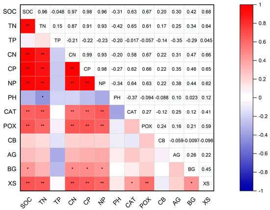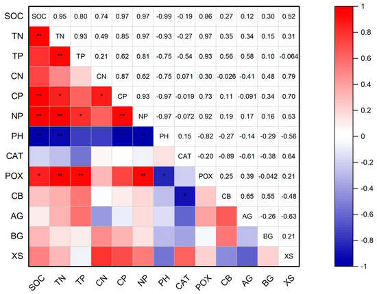 The correlation analysis results revealed significant relationships between soil physicochemical properties and enzyme activities (p < 0.05), highlighting the critical role of decreased log decomposition in regulating carbon, nitrogen, and phosphorus cycling and enzyme activities. There were significant positive correlations between the SOC, TN, C/N ratio, C/P, and N/P in soils under downed logs (r > 0.95 and p < 0.01), suggesting a close link between SOC accumulation and the increases in the C/N and C/P ratios. SOC was also significantly positively correlated with several enzyme activities, including POX, BG, and XS (r = 0.67, 0.42, and 0.68, respectively; p < 0.05 or p < 0.01), reflecting the role of SOC in promoting carbon transformation-related enzyme activities. The soil pH was negatively correlated with TN (r = −0.34 and p < 0.05), likely due to the organic acids released during log decomposition causing soil acidification, which in turn regulated enzyme activity. BG and XS activities exhibited a strong positive correlation (r = 0.65 and p < 0.01), suggesting their synergistic role in carbohydrate transformation processes. No correlations were detected between any of the soil indices under the downed logs and TP, CB, or AG (Figure 5).