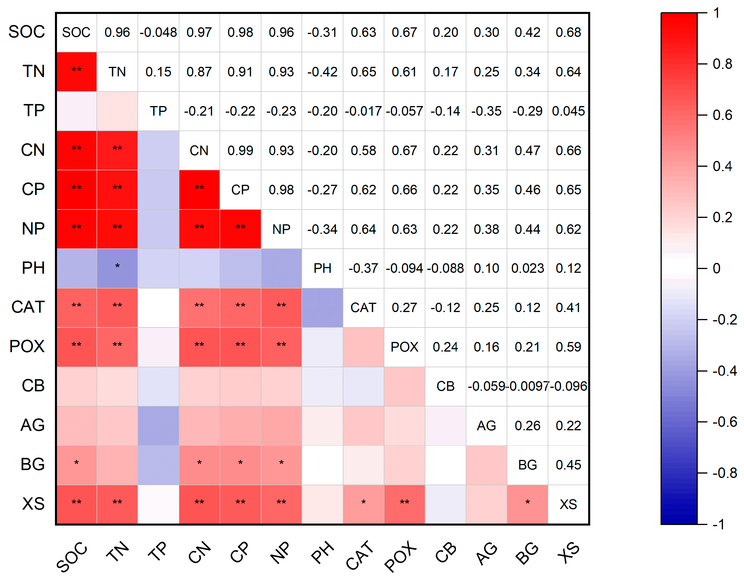 In the CK plots, soil pH was highly significantly negatively correlated with SOC, TN, N/P, and C/P (r = −0.99, −0.27, −0.75, and −0.75, respectively; p < 0.01), and it was significantly negatively correlated with POX activity (r = −0.82 and p < 0.01). SOC exhibited highly significant positive correlations with TN, the C/P ratio, and the N/P ratio (r = 0.93, 0.97, and 0.97, respectively; p < 0.01) and was also positively correlated with POX activity (r = 0.86 and p < 0.01), indicating that SOC accumulation might increase oxidase activity. SOC was significantly negatively correlated with pH (r = −0.99 and p < 0.01). Among the soil enzyme activities, only POX was significantly correlated with the soil physicochemical properties, with strong synergies with SOC, TN, and N/P (r = 0.86, 0.97, and 0.93, respectively; p < 0.01). No significant correlations were found between other soil enzymes (Figure 6).