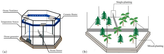 We transplanted two tree species with single (SP) and mixed planting (MP) (n = 3/per species) in each OTC, with 72 trees in total selected for measurement in this trial. The distribution of plants in OTCs is shown in Figure 1. O3 fumigation was carried out from 09:00 to 17:00 each day for 8 h, with fumigation stopped in rainy weather. The warming treatment was carried out for 24 h.