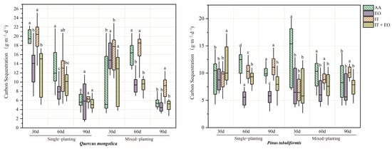 Carbon sequestration in Quercus mongolica and Pinus tabuliformis under single planting (SP) and mixed planting (MP) at 30 days, 60 days, and 90 days under ambient air (AA), elevated O3 (EO), increasing temperature (IT), and increasing temperature and elevated O3 (IT + EO). Small squares in the graphs represent mean values, and differences in lowercase letters above the boxes indicate significant differences in the amount of CS under the different treatments in the same period (p = 0.05).