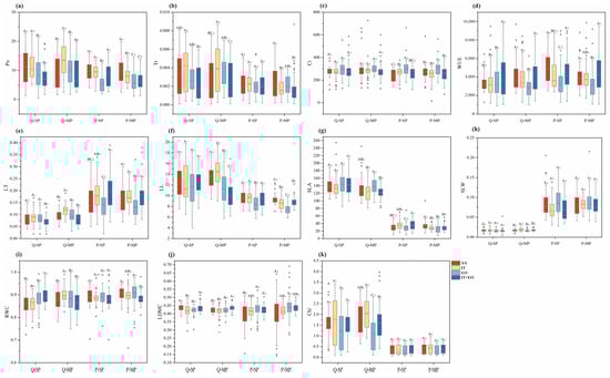 Different treatments and planting patterns significantly affected the traits (p < 0.05) (Figure 3). Overall, mixed planting enhanced the contribution of traits to CS in Q. mongolica, but weakened their contribution to CS in P. tabuliformis (Figure 4). For Q. mongolica, 70.5% of the indicators showed that traits under MP were improved compared to SP. Photosynthetic parameters (Pn, Tr, Ci, WUE, and Chl) increased under MP, as well as morphological traits (LT and SLW). In contrast, 52.7% of the indicators of P. tabuliformis showed that traits under MP showed a decrease compared to SP. WUE and LL significantly decreased.