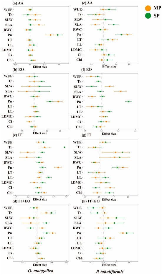 Comparing the effects of single planting and mixed planting in Quercus mongolica (a–d) and Pinus tabuliformis (e–h) functional traits on carbon sequestration under ambient air (AA), elevated ozone (EO), increasing temperature (IT) and their combination (EO + IT). Orange circles represent effect size in mixed planting, green circles effect size in single planting, and error lines 95% confidence intervals.