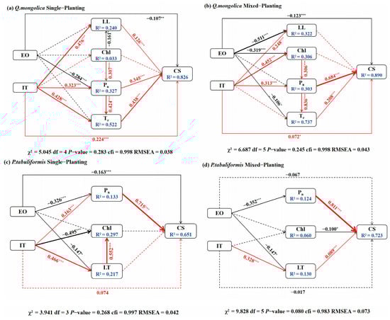 Under EO, MP altered trait-to-CS effects by 68.2%, with the most pronounced change observed in Q. mongolica, which altered trait-to-CS effects by 43.4% (24.9% for P. tabuliformis). Under both IT and EO + IT, mixed planting changed trait-to-CS effects by 59.1%, with the greatest alteration for P. tabuliformis: 42.9% under IT (16.2% for Q. mongolica) and 48.4% under EO + IT (10.7% for Q. mongolica).
