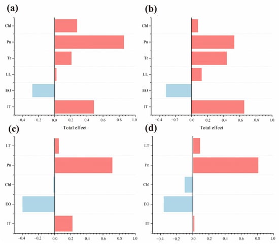 Total effects of elevated ozone, increasing temperature, and traits in structural equation models. (a) Quercus mongolica single planting, (b) Quercus mongolica mixed planting, (c) Pinus tabuliformis single planting, (c,d) Pinus tabuliformis mixed planting. Red represents a positive effect and blue represents a negative total effect.