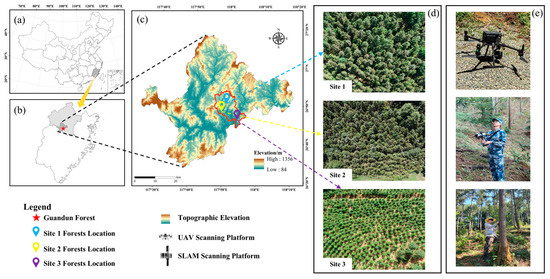 Location of the study area: (a) Fujian Province of China; (b) Nanping City; (c) topographic map of Shunchang County; (d) aerial view of site distribution; (e) UAV-LiDAR, LiDAR-SLAM, and ground data survey.