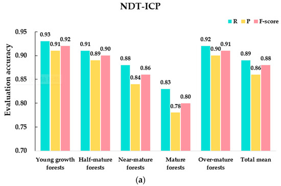 Figure 8 shows the registration results of two-point cloud datasets using the three registration algorithms (NDT-ICP, NDT-GICP, and NDT-VGICP) from a global perspective. Analyzing from a terrain perspective, all three algorithms show good registration performance in handling complex terrain or dense stands. However, compared to the others, the NDT-VGICP algorithm demonstrates a distinct advantage in similarly complex scenarios, achieving tighter registration and fusion of the two datasets, whereas NDT-ICP and NDT-GICP exhibit larger deviations in alignment. From the perspective of age groups, the NDT-VGICP algorithm provides the best registration and fusion performance across all age group stages, displaying strong adaptability, particularly with high accuracy and robustness when processing middle-aged and near-mature stands. In contrast, the other two algorithms show significant performance variation across different age groups.
