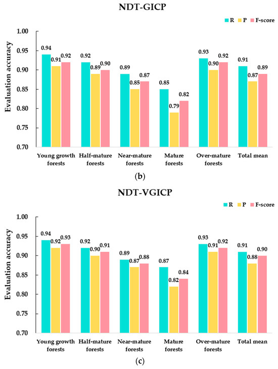 Comparison of the optimized registration algorithm and the traditional algorithm across different age groups. (a) NDT-ICP algorithms; (b) NDT-GICP algorithms; (c) NDT-VGICP algorithms. “Y” represents young-growth forests; “H” represents half-mature forests; “N” represents near-mature forests; “M” represents mature forests; and “O” represents over-mature forests. The different colored columns in the figure represent different age groups.