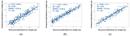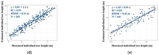 Accuracy was assessed by validating the remotely sensed heights of 1145 individual trees against the field-measured heights. For the stands, the average tree height from remote sensing in the 15 plots was validated against the field-measured average heights. The results are shown in Figure 13a,b.