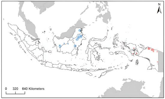 In 2020, we collected logging emissions data in 5 natural forest management concessions in Kalimantan and 10 in the Papuan provinces (Figure 1, Table 1). Here, we combine these data with those collected [13] using the same sampling protocol in 2010–2012 in 9 other concessions in Kalimantan (Table 1). Two of those 9 (F and H) were in the same concession but are treated as replicates because the data were collected in different areas harvested in different years by different staff and under different management plans. Sampled concessions were selected in a stratified random manner after first carrying out a multivariate cluster analysis of all possible concessions based on landscape metrics likely associated with forest structure and logging practices (topography, distance to market, landcover, and soil type) using Wards Linkages with Euclidian distances [22,23]. In 25–100 ha logging blocks censused <1 year after logging, we measured felled tree remainders and tree deaths due to collateral damage from felling, skidding logs from stumps to roadside log yards, and forest clearing for haul roads and log yards using the RIL-C Sampling Protocol for details about sampling protocols, see [18]. This approach to measuring carbon emissions from selective logging involves sampling only where harvests occurred, thus avoiding time spent sampling intact portions of areas assigned for logging [24]. While this sampling method is not suitable for monitoring post-logging recovery, its widespread use across the tropics allows direct comparisons of the results of studies on the stand damage and carbon emissions from selective logging [12,13]. Through interviews with forest managers and field observations, we determined whether sampled blocks were previously logged; this assessment was rendered difficult due to frequently redrawn block boundaries, lost records, and the low intensity and spatial heterogeneity of selective logging [24].