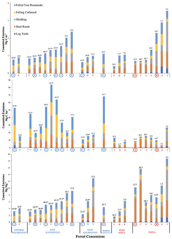 Comparisons of mean carbon emissions (Mg C) from skid trails and haul road construction per m3 of extracted timber (left), as Mg C ha−1 (center), and as the CIF (right). FSC-certified concessions are circled: blue for Kalimantan and red for Papua. An asterisk adjacent to the alphabetic concession code indicates that there was evidence of previous industrial logging in the sampled block.