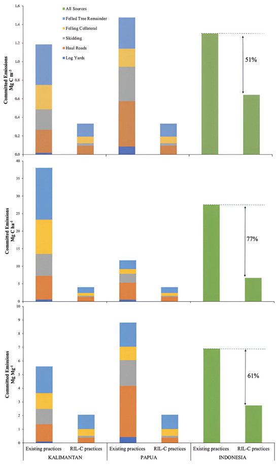 When considering RIL-C’s potential across Indonesia, concessions in Kalimantan recently (2018–2021) produced the most logs, accounting for about 3.81 × 106 m3 per year on average [18,19,20,21], with a potential annual emissions reduction of 9.21 Tg CO2. With Papua’s 1.23 × 106 m3 of annual log production, the potential annual emissions reduction from the use of RIL-C practices is 2.98 Tg CO2. In contrast, Bali, Nusa Tenggara, and Sulawesi together produce only 0.02 × 106 m3 of timber per year, with a correspondingly low potential annual emissions reduction of only 0.04 Tg CO2. Country-wide use of RIL-C practices would contribute 2.9% to meeting Indonesia’s NDC target for the FOLU sector [based on the total emission reduction of 14.47 Tg CO2 and target reduction of 500 Tg CO2].