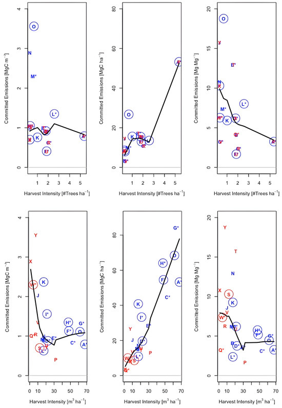 Effects of harvest intensity expressed as m3 ha−1 (upper three panels) and as number of trees harvested ha−1 (lower three panels) on logging emissions per m3 of extracted timber (left), as Mg C ha−1 (center), and as the CIF (right). The drawn lines visualize the trends through the moving central tendency of the committed emissions-harvest intensity relationships (FSC-certified concessions circled; blue for Kalimantan, red for Papua). An asterisk adjacent to the alphabetic concession code indicates that there was evidence of previous industrial logging in the sampled block.