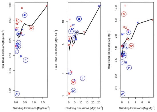 The highest CIF value observed was from Concession Y in Papua, which harvested only 7.5 m3 ha−1 but showed high emissions from both skidding and haul road construction. One suggested reason for these elevated emissions is that the concession’s soils are low in trafficability when wet and gravel is not readily available; their roads tend to widen over time as drivers avoid rutted and otherwise impassable sections. Although we expected skid trails to substitute in part for roads, the emissions data from across Indonesia revealed no such pattern (Figure 5). It should also be noted that most roads in the Papuan concessions were newly opened, whereas in Kalimantan, 10 of the 15 censused logging blocks were previously harvested, which allowed some re-use of old roads. The worst performing concession in Papua also used extremely old logging equipment, which may have exacerbated their roading problems. Among all 25 concessions sampled, the highest road emissions and the second highest CIF were from another Papuan concession (Concession T) that harvested much more intensively (20.7 m3 ha−1); interestingly, emissions from this concession are low if expressed per hectare or per cubic meter (Figure 2). This same switch from a high CIF value to relatively low emissions per m3 and per ha was found for Concession N in West Kalimantan, which harvested 17.3 m3 ha−1 of timber.