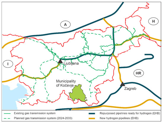 A map of the existing and planned Slovenian gas transmission system [30] with envisioned hydrogen pipelines within the European Hydrogen Backbone (EHB) strategy [10].