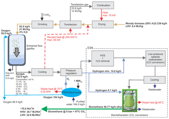 Based on a review of the best available and proven gasification technologies, existing projects, and scientific confirmations from different sources, we propose the conceptual solution of converting woody biomass into biomethane by considering the high level of utilization of waste heat streams and the electrolysis side product (i.e., oxygen). The solution, schematically shown in Figure 2, shows the relevant mass flow rates and heat streams within the entire process. Values are normalized based on the selected nominal electrolysis power consumption of 1 MWel. The proposed solution involves the following main process units: