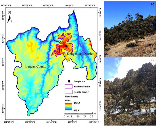 The Jiaozi Mountain in Kunming, Yunnan, China. (A) The shrub plot in summer, and (B) the tree plot in early spring.