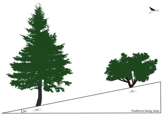 To characterize differences in climatic conditions, the free-air temperature, air relative humidity, wind speed, and wind direction were obtained from Vantage Pro2 meteorological stations (Davis Instruments, Hayward, CA, USA) located 50 m from the plot edge to avoid interference from the trees and shrubs. They were located on relatively flat and open grasslands on the southeast-facing side of the plots, where the climate was measured at a height of two meters. The temperature and relative humidity of trees and shrubs in the canopy, stem, and root zones (10 cm belowground) were recorded by HOBO Pro v2 loggers (Onset, Bourne, MA, USA). In each sample plot, three individuals were randomly selected to place loggers in an area at least 10 m from the open space. Position of loggers: 1. canopy: loggers were placed in the middle of the north-facing branches; 2. stem: loggers were placed facing north of the stem.; 3. soil: loggers were placed directly below the stem (10 cm belowground) (Figure 2). The height of the loggers on each tree and shrub is shown in Table 1. Loggers had acrylonitrile styrene acrylate copolymer housing and a polypropylene ultraviolet protective cap. Loggers in the canopy and stem were placed to avoid the effects of direct sunlight. The meteorological station and loggers have accuracies of ±0.3 °C and ±0.2 °C for temperature, respectively, and ±2% and ±2.5% for relative humidity.