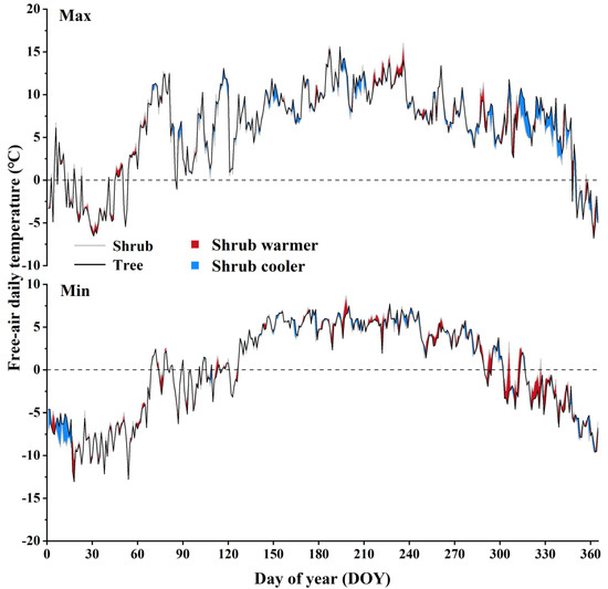 The maximum and minimum free-air temperatures of shrubs and trees in Jiaozi Mountain, Yunnan, China, in 2022. The grey line indicates the free-air temperature of shrubs, and the black line indicates the free-air temperature of trees. Red fill indicates warmer conditions for shrubs relative to trees, and blue fill the opposite. Dashed horizontal lines mark 0 °C.