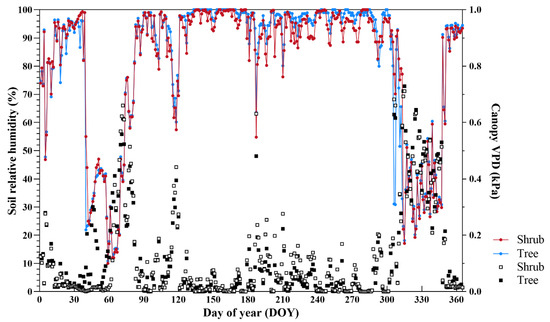 The soil’s relative humidity was high in both the shrub and tree plots, especially during the frost-free season, when the relative humidity was almost 100% (Figure 4). The soil’s relative humidity in both the shrub and tree plots during the DOY 40–81 and DOY 314–347 was lower than 70%, but the canopy VPD was lower than 0.8 kPa. This indicates that moisture was not the main factor limiting the growth and survival of shrubs and trees.