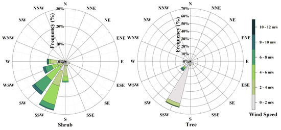The region is mainly affected by the southwest monsoon, and both the shrub and tree plots were dominated by southwest winds, which is consistent with the wind direction pattern in the region (Figure 5). The frequency of winds exceeding 2 m/s was higher in the shrub plot (75.62%) than in the tree plot (20.55%). Therefore, in general, the shrub plot had higher wind speeds and was thus more exposed to strong winds.