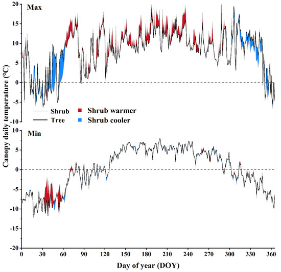 The maximum and minimum canopy temperatures of shrubs and trees in Jiaozi Mountain, Yunnan, China, in 2022. The grey line indicates the canopy temperature of shrubs, and the black line indicates the canopy temperature of trees. Red fill indicates warmer conditions for shrubs relative to trees, and blue fill the opposite. Dashed horizontal lines mark 0 °C.