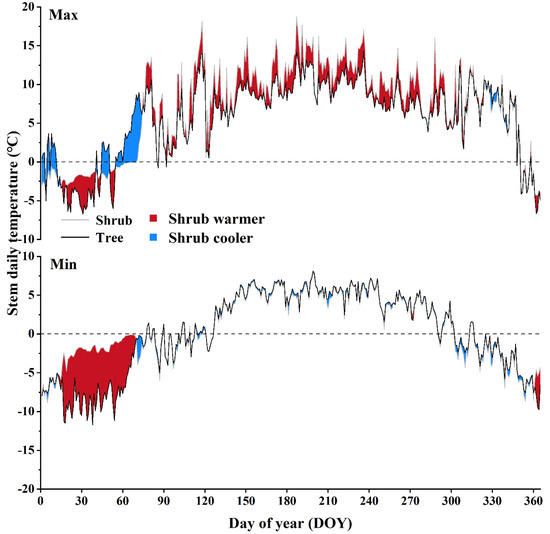 The maximum and minimum stem temperatures of shrubs and trees in Jiaozi Mountain, Yunnan, China, in 2022. The grey line indicates the stem temperature of shrubs, and the black line indicates the stem temperature of trees. Red fill indicates warmer conditions for shrubs relative to trees, and blue fill the opposite. Dashed horizontal lines mark 0 °C.
