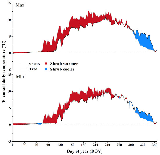 Low shrubs created a more favorable root zone temperature than tall trees. The maximum, mean, and minimum soil temperatures under shrubs were significantly higher than those of trees (Table 2 and Table 3 and Figure 8). Shrub soil temperatures warmed earlier than tree soil temperatures. Shrub soil temperatures started to warm on DOY 77, while tree soil temperatures started to warm on DOY 108. Changes in soil temperature lagged behind changes in air temperature. In spring, the first warming of shrub soil occurred 11 days later than that of air temperature, while the first warming of tree soil occurred 41 days later than that of air temperature.