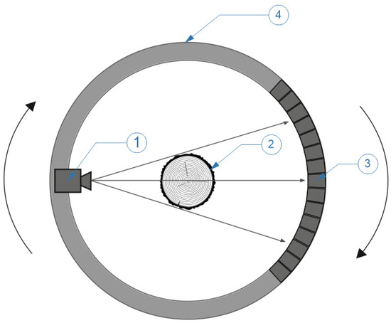 Each log section is scanned using a CT scanner. The scanning of the internal features is performed using three-dimensional computed tomography. During the scanning process, the object is smoothly inserted into a rotating ring via a rubber belt. The radiation source is positioned opposite the detectors on either side of the ring.